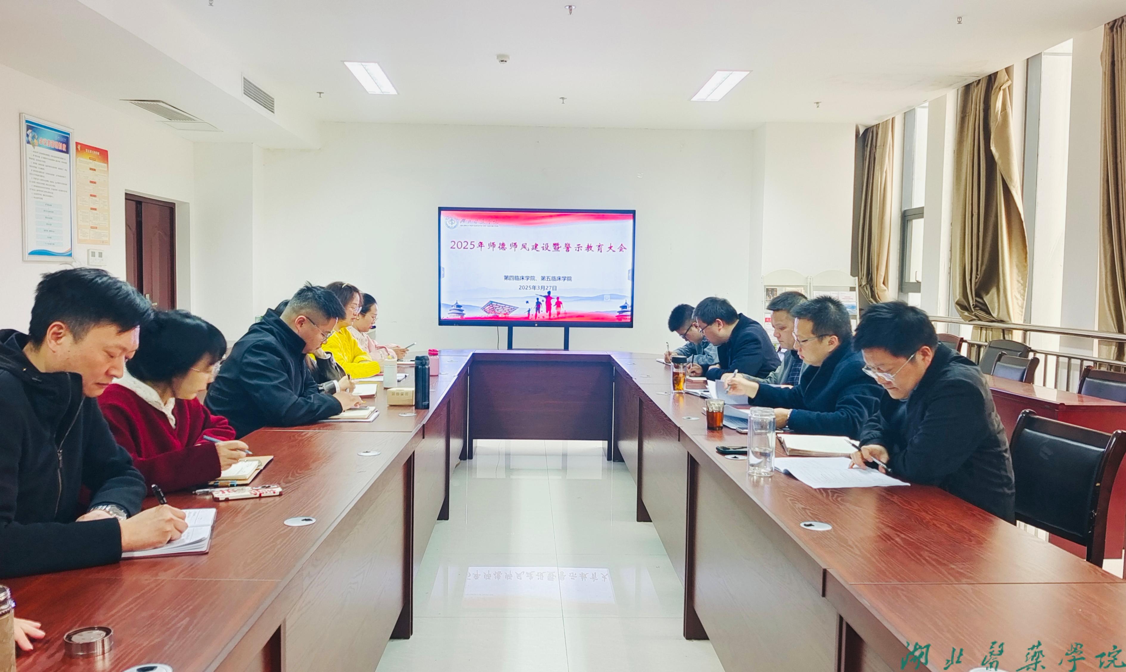 本网讯(通讯员 黄兆辉)3月27日下午,第四临床学院和第五临床学院在科教楼513会议室联合开展2025年师德师风建设暨警示教育大会。第四临床学院、第五临床学院十堰校区全体教职工参加会议。