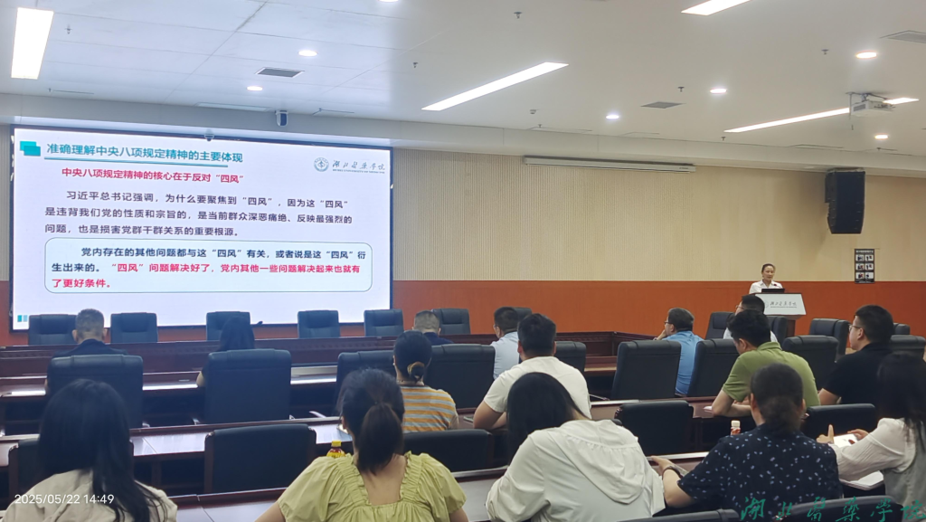 谭艳以《坚守教育初心、践行八项规定精神,以优良作风推动高校高质量发展》为主题,从“深刻认识八项规定的政治内涵与精神要求”“聚焦人事领域突出问题,筑牢纪律防线”“践行八项规定精神,争做新时代的‘大先生’”等三个方面,系统回顾了中央八项规定出台的背景与历史嬗变,阐述了中央八项规定精神内容与师德师风的关系,强调了加强作风建设的重要意义,明确了高校教师在深入贯彻中央八项规定精神学习教育中的作为担当。她结合违反中央八项规定精神的“四风”问题具体行为,以案说法,以例鸣钟,强调教师要在政治上占好位,在作为上要强担当,在本领上要提好质,争做“大先生”。
