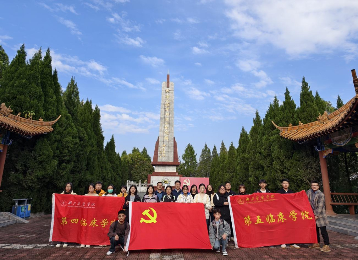 本网讯(通讯员 彭孟琦 何金轩)为深化党史学习教育,传承红色基因,11月14日下午,第四、第五临床学院联合组织全体教职工党员及学生预备党员前往十堰市郧阳区南化塘烈士陵园,开展“缅怀先烈强信念,医心向党践初心”主题党性实践教育活动,通过庄严的仪式教育、沉浸式参观学习及互动交流,进一步强化师生党员的使命担当。