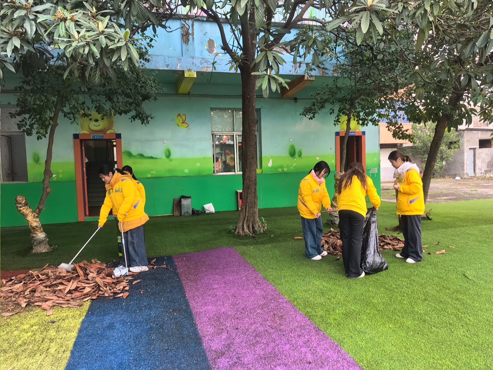 活动伊始,志愿者们对康复中心园区环境进行清理,分工清扫地面落叶、捡拾杂物、整理活动区域,为孩子们营造干净整洁的活动环境。