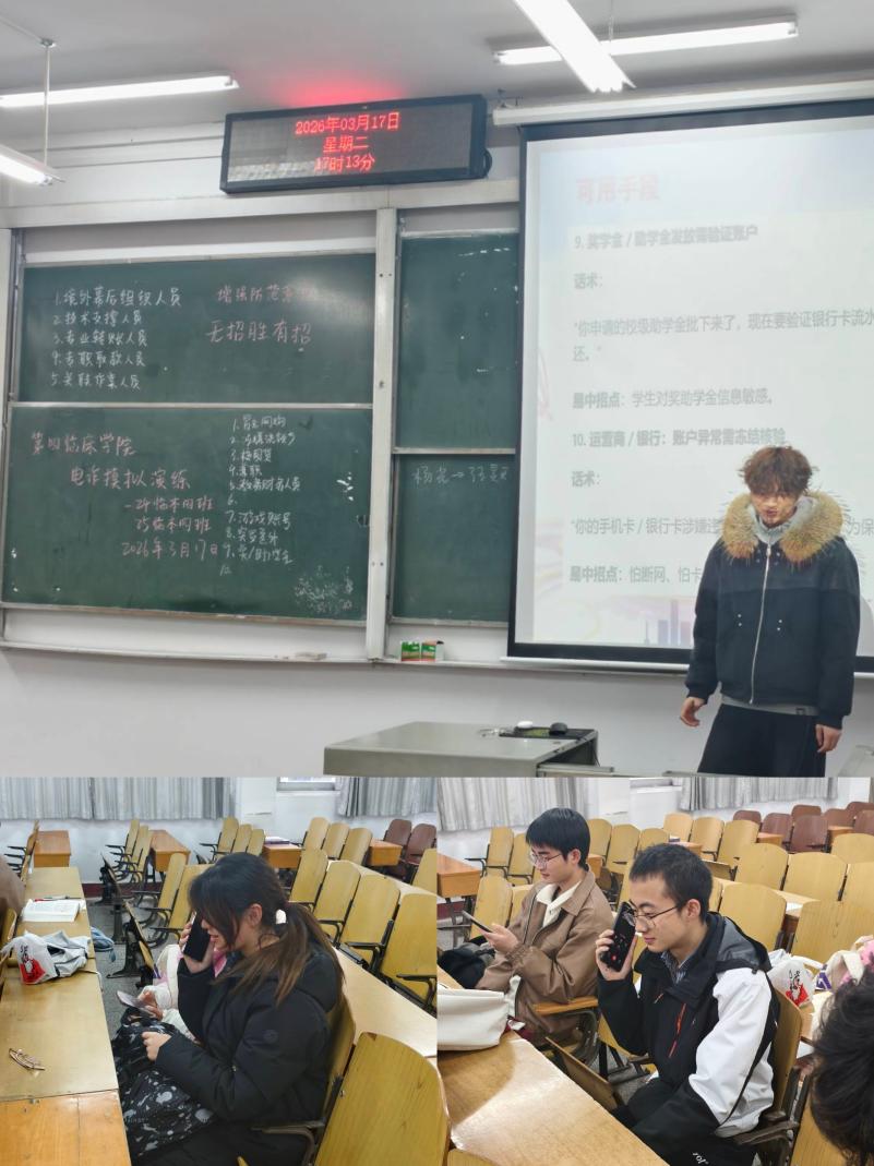 本网讯(通讯员 郑雯艺 闫梦琪)“同学,你的医保需要紧急补办,点击这条链接填写个人信息即可办理!”“兼职刷单零门槛,一单返利50元,扫码进群即刻赚钱!”3月17日下午,第四临床学院十堰校区5304教室一改往日宁静,此起彼伏的“诈骗话术”轮番响起,一场高度还原真实场景的沉浸式电信诈骗模拟演练正式拉开帷幕。此次演练面向该院2024级、2025级全体学生,精心抽取20名同学参与实战互动,5名志愿者化身“诈骗分子”,以花式套路发起反诈“攻防战”,让在场学子切身感受诈骗陷阱的隐蔽性与危害性。