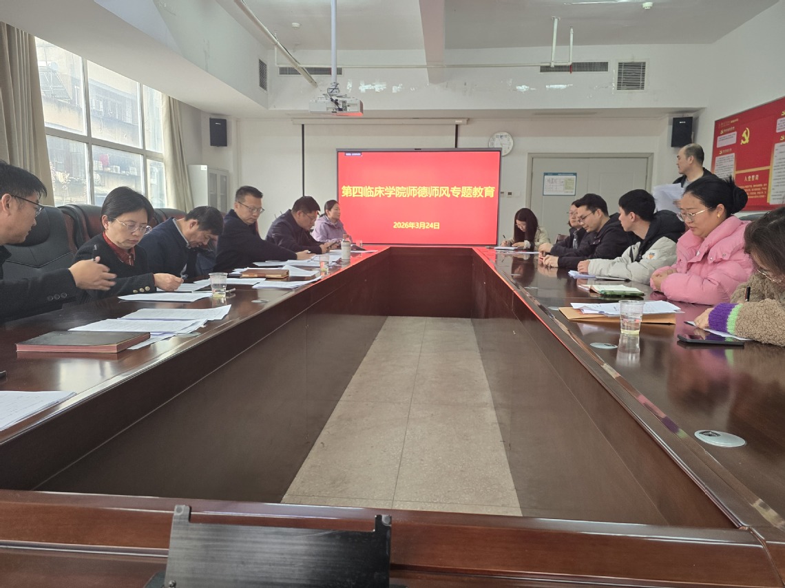 本网讯(通讯员 何金轩)为深入学习贯彻习近平总书记关于教育的重要论述和师德师风建设系列重要指示精神,落实学校教师队伍思想政治建设工作要求,弘扬教育家精神、筑牢师德根基,3月24日,第四临床学院在襄阳校区康智楼304会议室开展师德师风专题教育活动。学院领导班子、全体教职工参会,会议由学院党委书记赵国新主持。